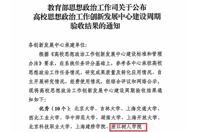 近日,教育部思想政治工作司发布高校思想政治工作创新发展中心建设周期验收结果通知,经综合评议和网络公示,教育部高校思想政治工作创新发展中心(浙江树人学院)(以下简称“中心”)在此次验收中获评优秀等级,跻身全国10个优秀行列,与北京大学、吉林大学、上海交通大学等高校同台获评优秀,充分彰显了我校在思想政治工作领域的建设成效、创新水平与示范价值。中心自2022年2月启动建设以来,在教育部思想政治工作司、省委教育工委和学校党委的领导下,...